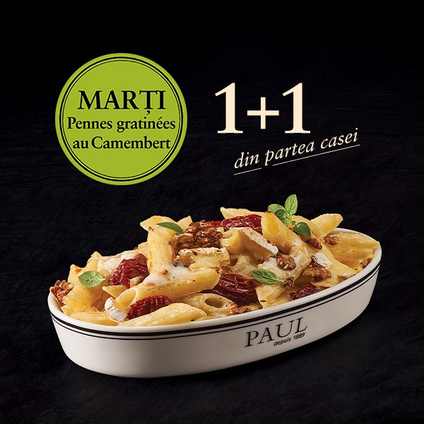 Marți, la PAUL ai oferta de prânz perfectă pentru un randez-vous în doi. Oferta 1+1 la Pennes gratinées au Camembert este disponibilă doar la PAUL Universitate. Imaginile sunt cu titlu de prezentare și nu pot fi reproduse.