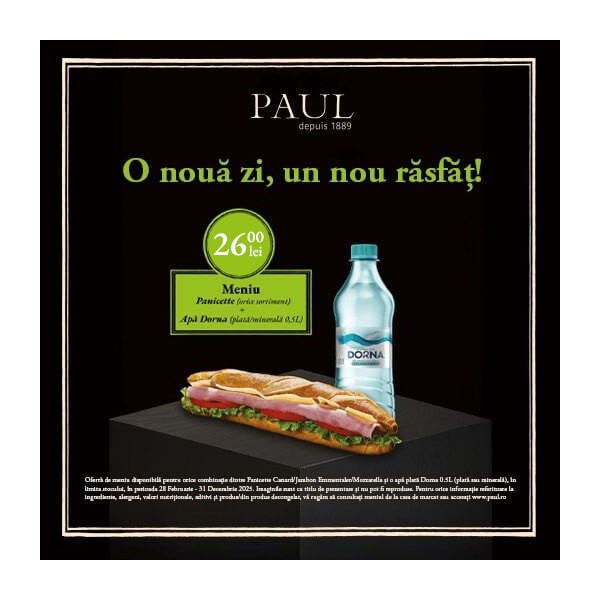 Imaginile sunt cu titlu de prezentare și nu pot fi reproduse. Produse disponibile în limita stocului, în toate brutăriile PAUL. Pentru orice informație referitoare la ingrediente, alergeni, valori nutriționale, aditivi și produs/din produs decingelat, vă rugăm să consultați meniul de la casa de marcat sau accesați www.paul.ro